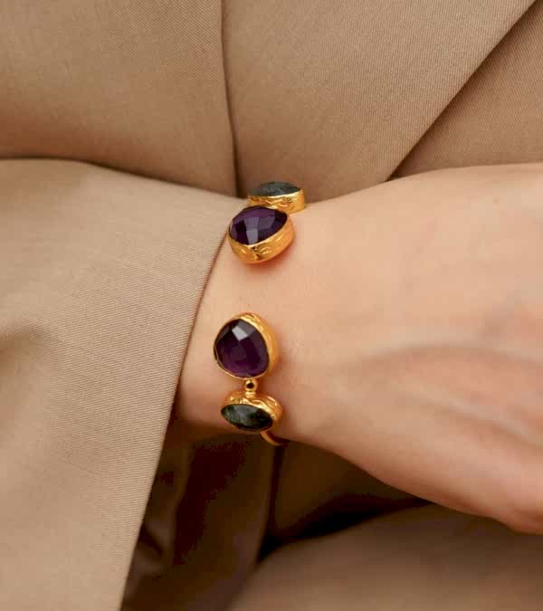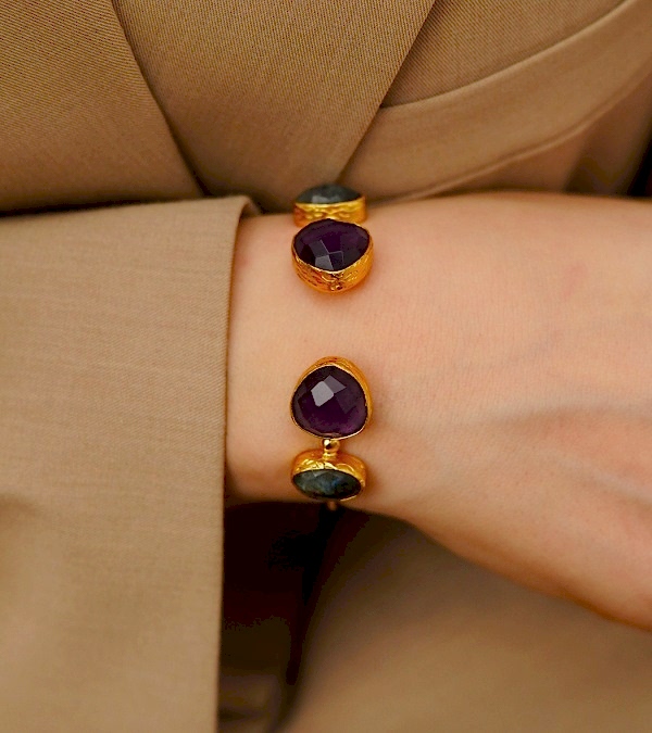 Labradorit ve Ametist Taşlı El Yapımı Altın Kaplama Pirinç Bileklik